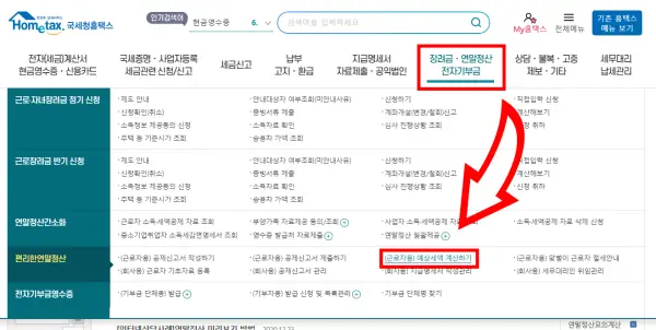 상단메뉴에 "장려금·연말정산전자기부금"을 찾으셨다면 마우스를 올려주세요. 드롭메뉴로 캡처 사진처럼 추가적인 메뉴가 보이실 거예요. 편리한 연말정산 카테고리에 "(근로자용) 예상세액 계산하기"라는 메뉴를 클릭해 줍니다.