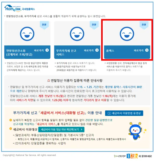 부가가치세 신고와 연말정산 간소화 서비스 기간이 맞물리면서 홈택스에 접속하면 기존과 다르게 원하는 메뉴로 바로 갈 수 있는 창이 하나 뜨게 되어 있습니다. 이때 세 번째 있는 "홈택스"쪽으로 접속해주셔야 환급금을 조회할 수 있는 예상세액 액 계산하기 메뉴를 이용할 수 있습니다.