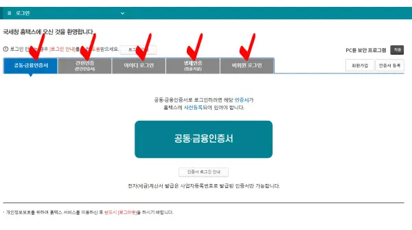 로그인은 필수겠죠? 본인 인증을 할 수 있는 편한방법으로 홈택스에 로그인해 줍니다.